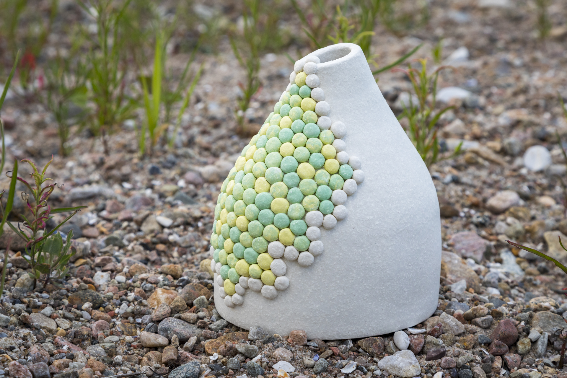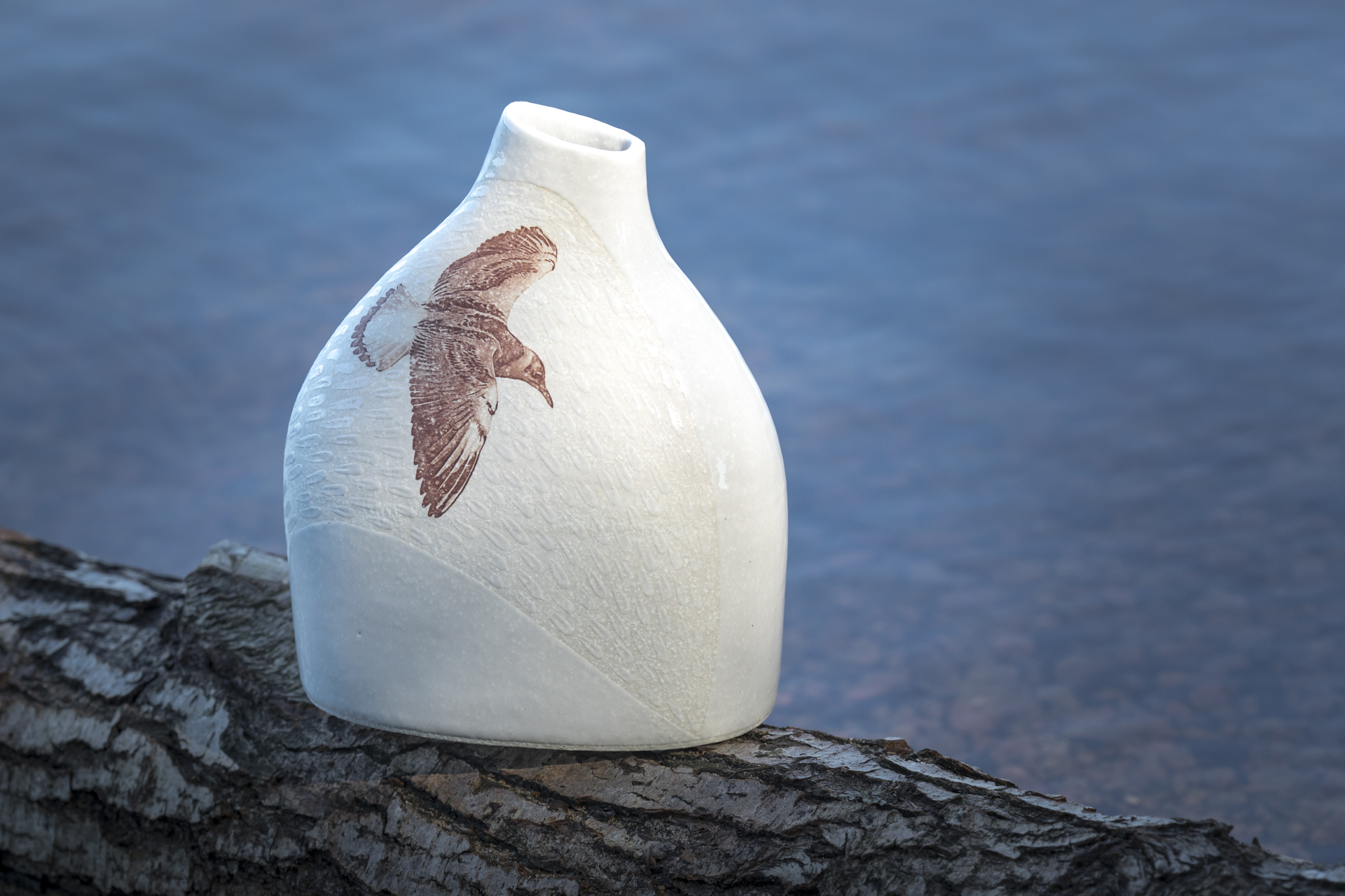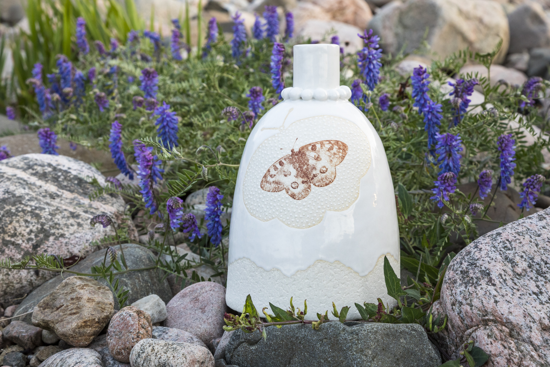 Jag skulpterar och bygger i stengods och porslin och låter ofta oglaserade detaljer visa lerans färg och struktur.