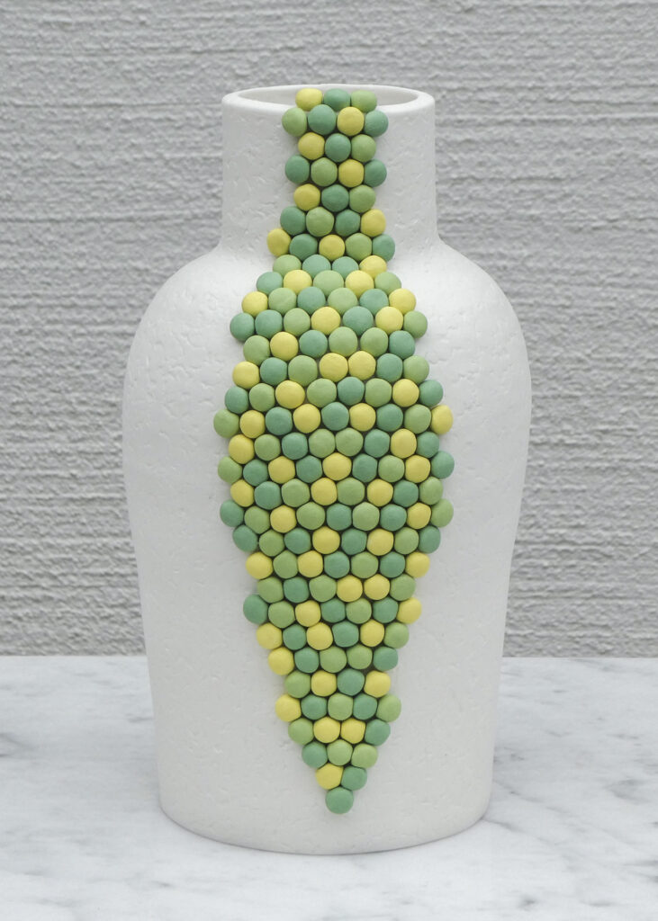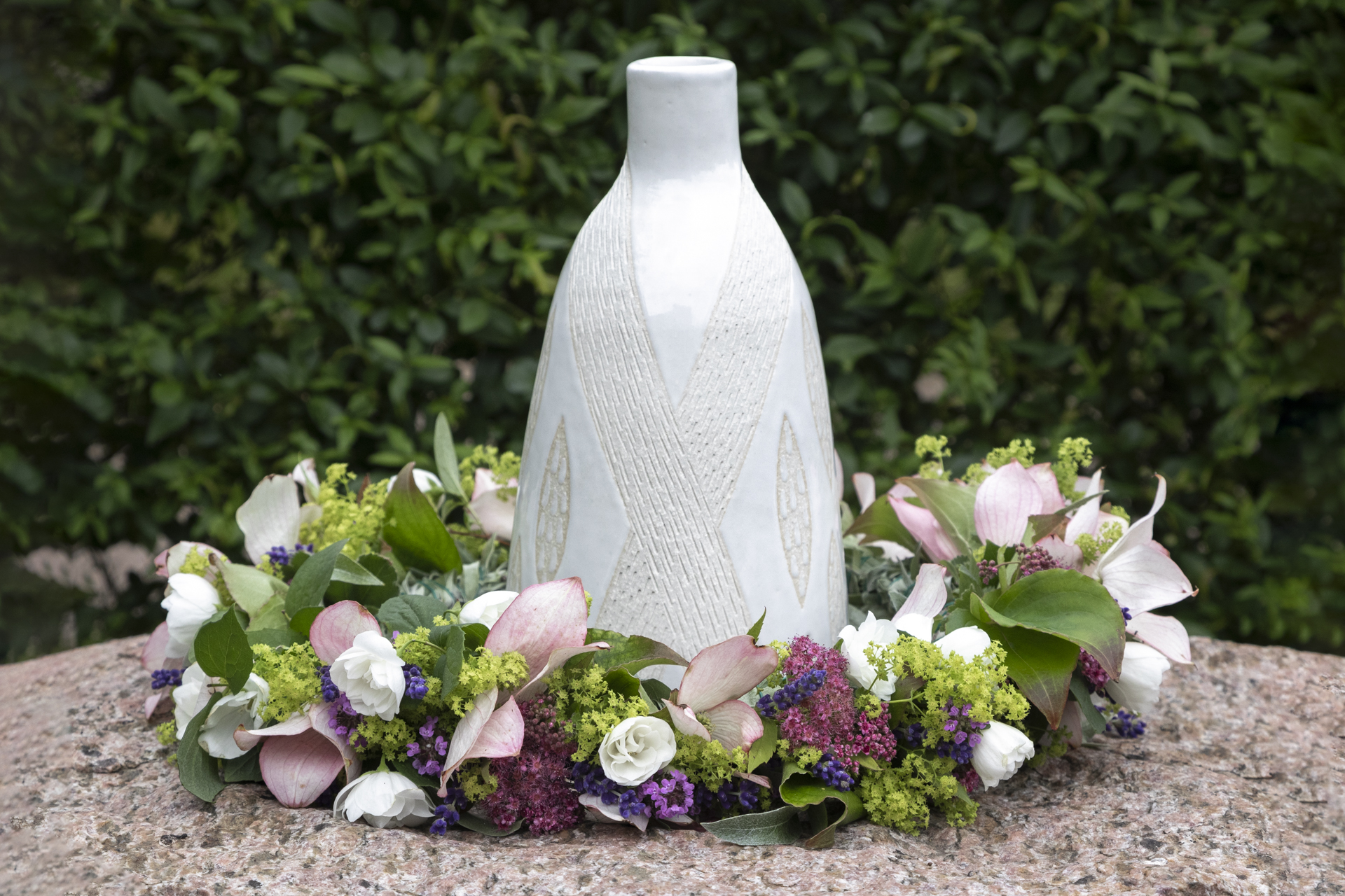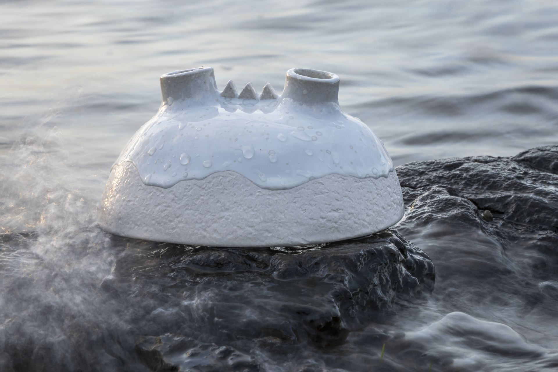 Jag skulpterar och bygger i stengods och porslin och låter ofta oglaserade detaljer visa lerans färg och struktur.